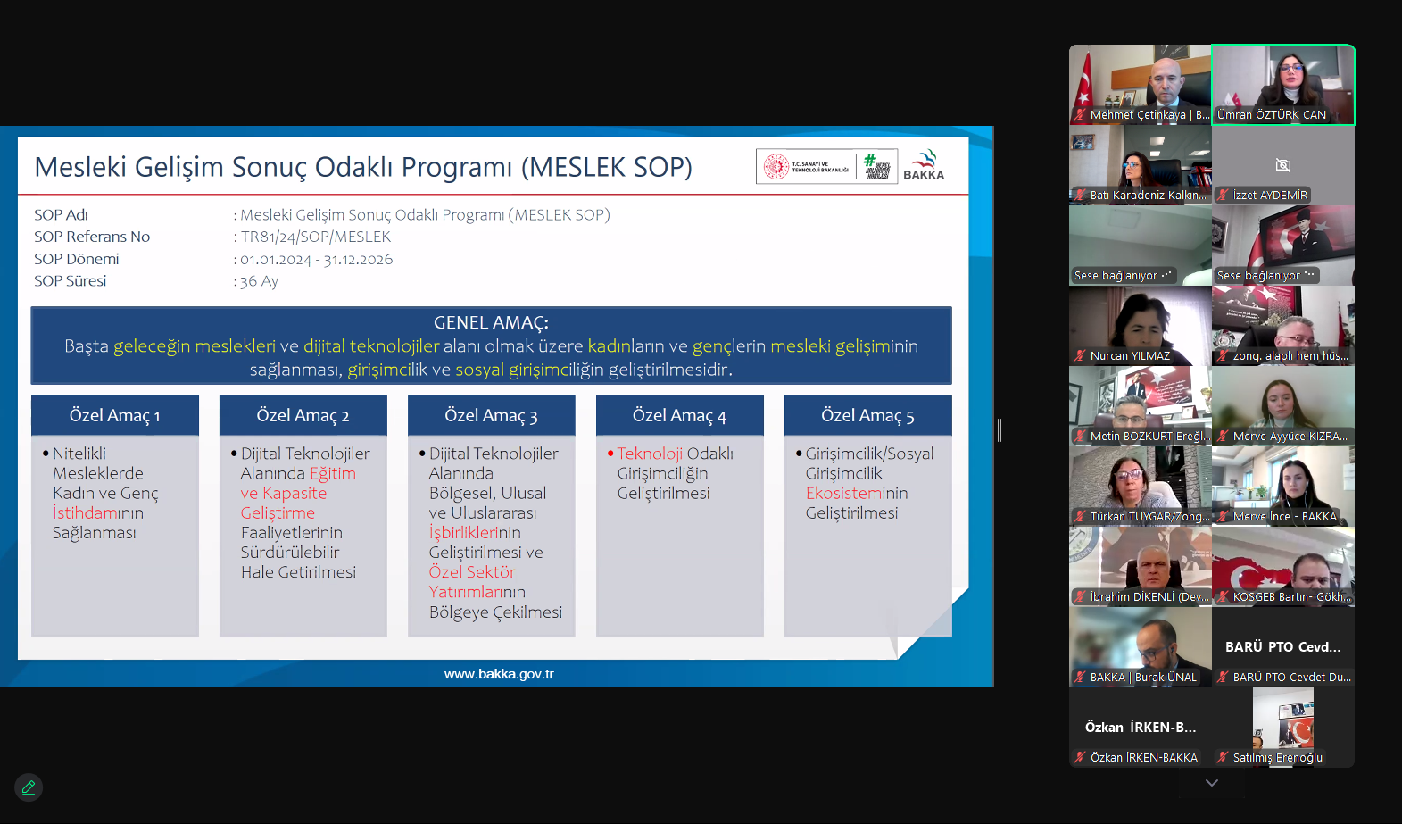 BAKKA Genel Sekreter V. Mehmet Çetinkaya’nın açılış konuşmasıyla başlayan toplantıda başta geleceğin meslekleri ve dijital teknolojiler alanı olmak üzere kadınların ve gençlerin mesleki gelişiminin sağlanmasının, girişimciliğin ve sosyal girişimciliğin geliştirilmesinin amaçlandığı vurgulanmıştır. Bölgede genç işsiz nüfusun fazlalığı ve nitelikli beşeri sermayenin göç etmesi gibi sorunların MESLEK SOP’un bölgenin sosyoekonomik gelişimi için önemini ortaya koyduğu ifade edilmiştir. Programın başarılı bir şekilde uygulanması ve hedeflere ulaşması için bu toplantının önemli bir kilometre taşı olduğu ifade edilmiştir.