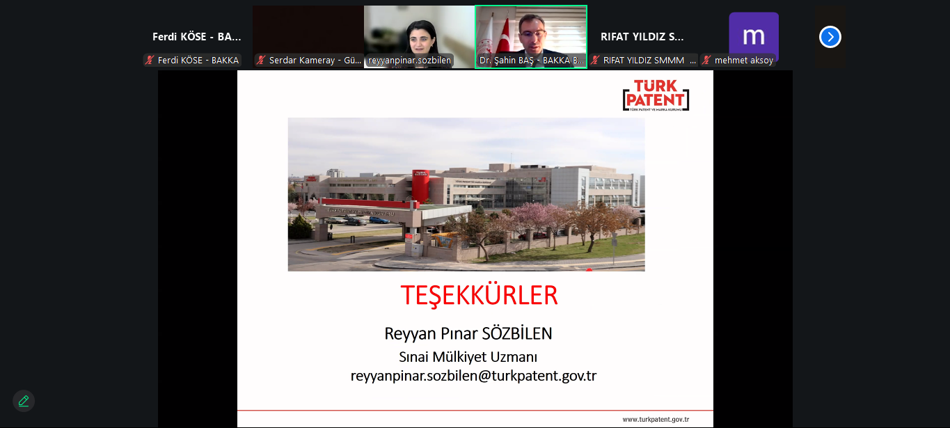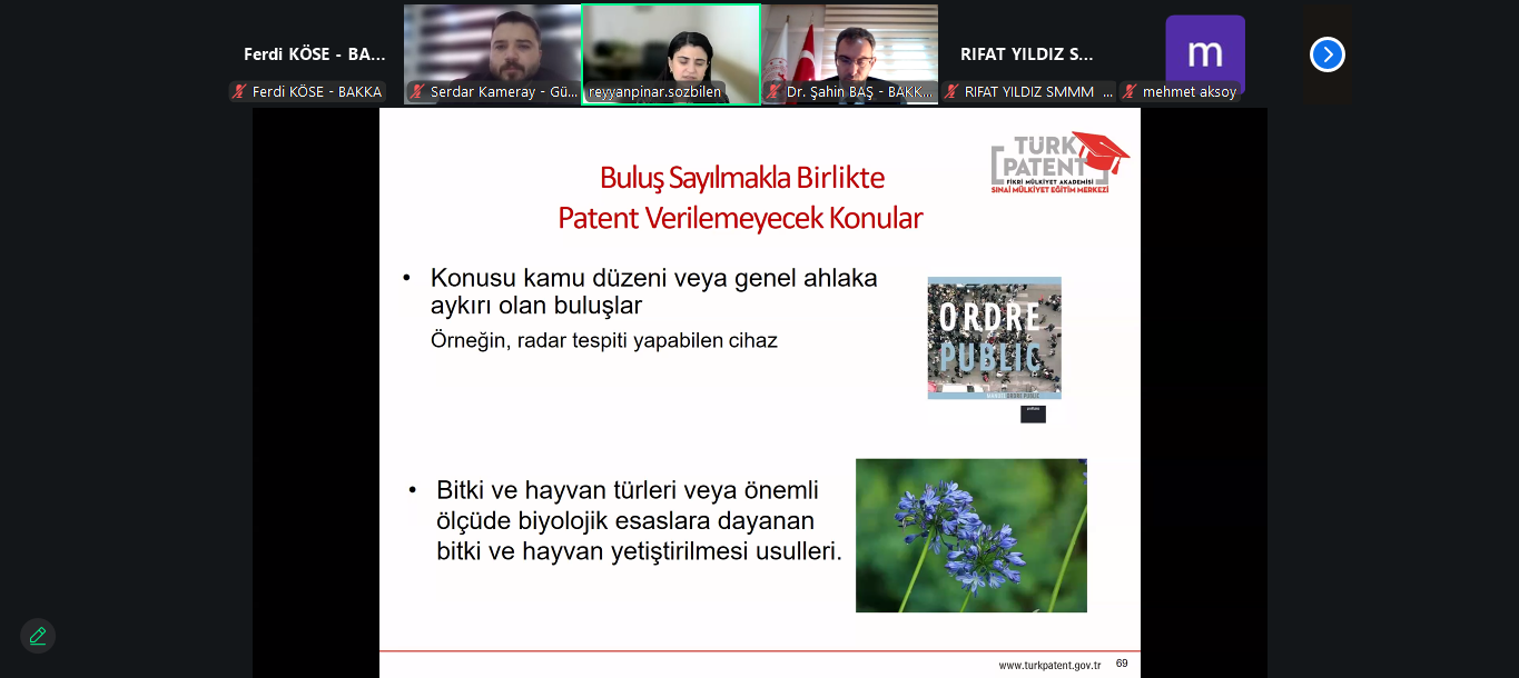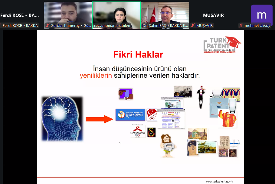 Webinarın moderatörlüğünü Bartın Yatırım Destek Ofisi Koordinatörü Dr. Şahin Baş üstlenirken, Türk Patent ve Marka Kurumundan Yenilik ve Tanıtım Dairesi Sınai Mülkiyet Uzmanı Reyyan Pınar Sözbilen, Markalar Dairesi Başkanlığı Sınai Mülkiyet Uzmanı Merve Koç Şahin ve Coğrafi İşaretler Dairesi Başkanlığı Sınai Mülkiyet Uzmanı Havva Çimen tarafından sunumlar gerçekleştirildi. Sunumlarda, marka ve patent başvuru süreçleri, tasarım tescilinin işletmelere sağladığı katkılar, faydalı modelin KOBİ’ler açısından önemi, coğrafi işaret ve geleneksel ürün adlarının yerel kalkınma üzerindeki etkileri ayrıntılı olarak ele alındı. Ayrıca başvuru süreçlerinde dikkat edilmesi gereken hususlar, doğru başvuru stratejileri, tescil sonrası hakların etkin kullanımı ve ulusal-uluslararası koruma mekanizmalarına ilişkin uygulamalı bilgiler katılımcılarla paylaşıldı.